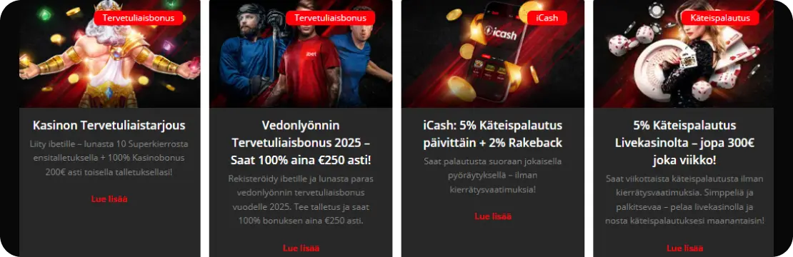 iBetin tarjoukset nojaavat kahteen teemaan: helppo aloitus ja jatkuva etu. Tervetulobonus on 100% jopa 100 euroon sloteille. Minimitalletus on 10 €, kierrätys 40x ja voimassaolo 30 päivää. Panoskatto pitää bonuspelaamisen selkeästi hallinnassa.